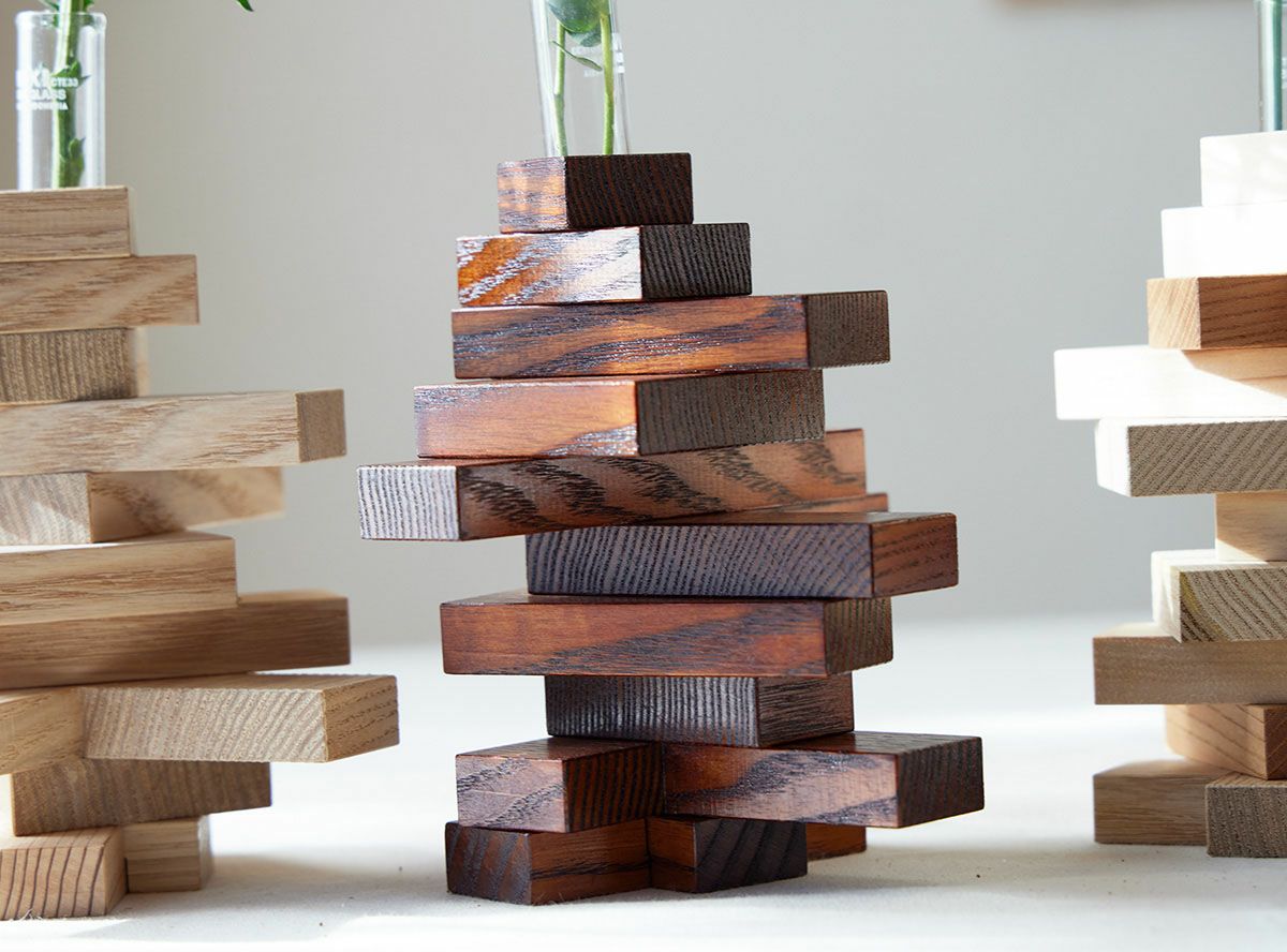 全て異なる11個のパーツを組み合わせて、自分だけの花器を組み上げることができます。 順番や向きを変えたり、数を減らしたりすることで、表情が変わります。 お花を飾りながら童心に帰って積み木遊びをしているような感覚も楽しむことができます。