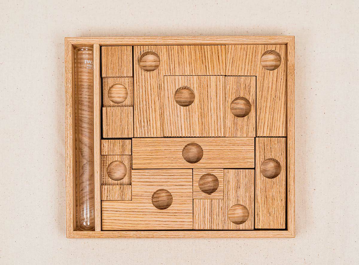 使わない時は、専用の木箱にパズルのようにぴったり収まります。 3.5cmの薄さの箱の中に入れて、コンパクトに収納することができます。
